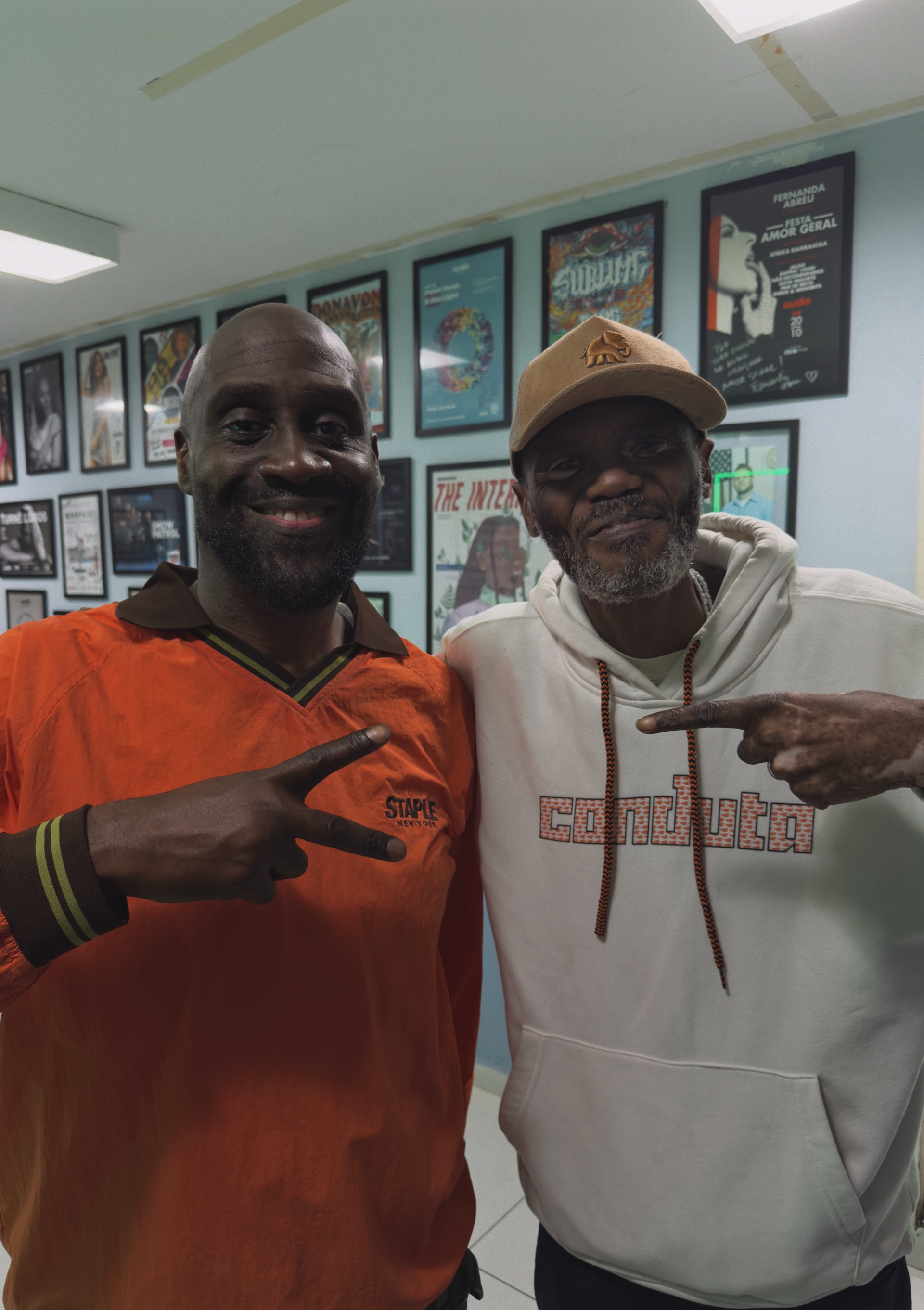 À esquerda, Pos, um dos meus MCEEs prediletos. À direita, meu irmão (Rappin Hood), responsável por me dar caminho pra desenvolver meus dotes musicais, numa espécie de continuação do que meus pais proporcionaram. Foi ele, via primo Natanael Valêncio, que apareceu com “o disco da capa colorida” lá em casa. De La Soul faz parte da minha vida faz tempo. É como o parente que mora longe e vem visitar, de vez em quando, trazendo boas novas. E tudo começa com o gesto de um irmão trazendo a novidade da rua pra dentro de casa. E assim como De La, a cultura mora lá, na vitrola, no discurso e no guarda-roupa de casa faz tempo. É preciso se apaixonar pelas palavras e batidas com a intensidade que o meu ser, a versão menino de 12 anos, se apaixonou.